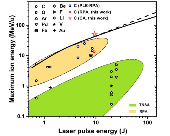 2019年1月,实验室颜学庆教授/马文君研究员团队近期在激光加速重离子领域获得重要进展。他们利用人工设计的双层纳米靶材,获得了能量高达580兆电子伏特(MeV)的碳离子,将飞秒激光加速重离子能量记录提高了两倍。相关结果以”Laser Acceleration of Highly Energetic Carbon Ions Using a Double-Layer Target Composed of Slightly Underdense Plasma and Ultrathin Foil”为题发表在物理评论快报上(Physical Review Letters 122,014803 (2019))。