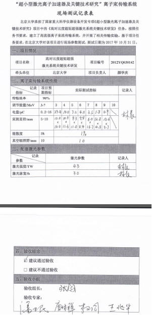 在国家重大仪器专项、重大科学问题导向项目(973A)、XXX专项和协同创新等项目的支持下,激光加速团队攻克了高对比度与高光强激光技术、自支撑纳米薄膜靶制备技术、超高流强离子束传输技术和激光加速器辐照研究平台等关键技术,最终建成世界上首台超小型激光加速器辐照装置(如图1所示),加速参数指标为1~15MeV质子束,总流强106-8个粒子/发。2017年激光加速器装置正式建成出束,并通过了同行专家的现场技术测试。实验中利用能谱仪、RCF和CR39,确认加速产生了能量1-15 MeV质子束(如图2所示),在加速稳定性测试实验中,进行了5发连打测试,显示质子截止能量的稳定性好于3%(如图3所示)。